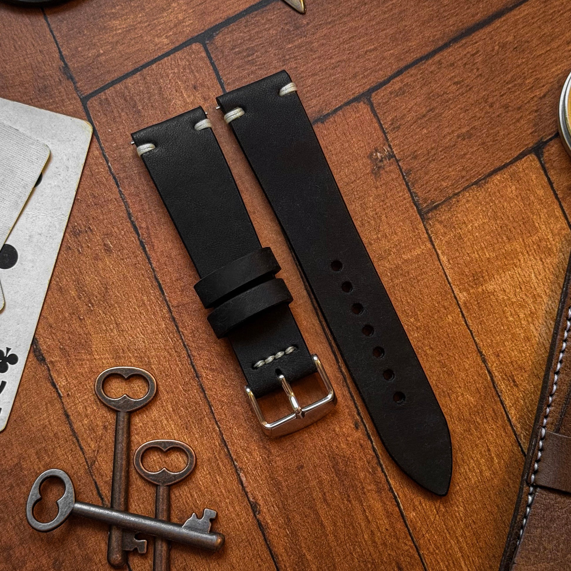 CRAFTED ENTIRELY BY HAND, EACH STRAP WILL CARRY SUBTLE VARIATIONS IN GRAIN, TONE, STITCHING, AND LENGTH — A NATURAL RESULT OF TRUE HANDWORK.